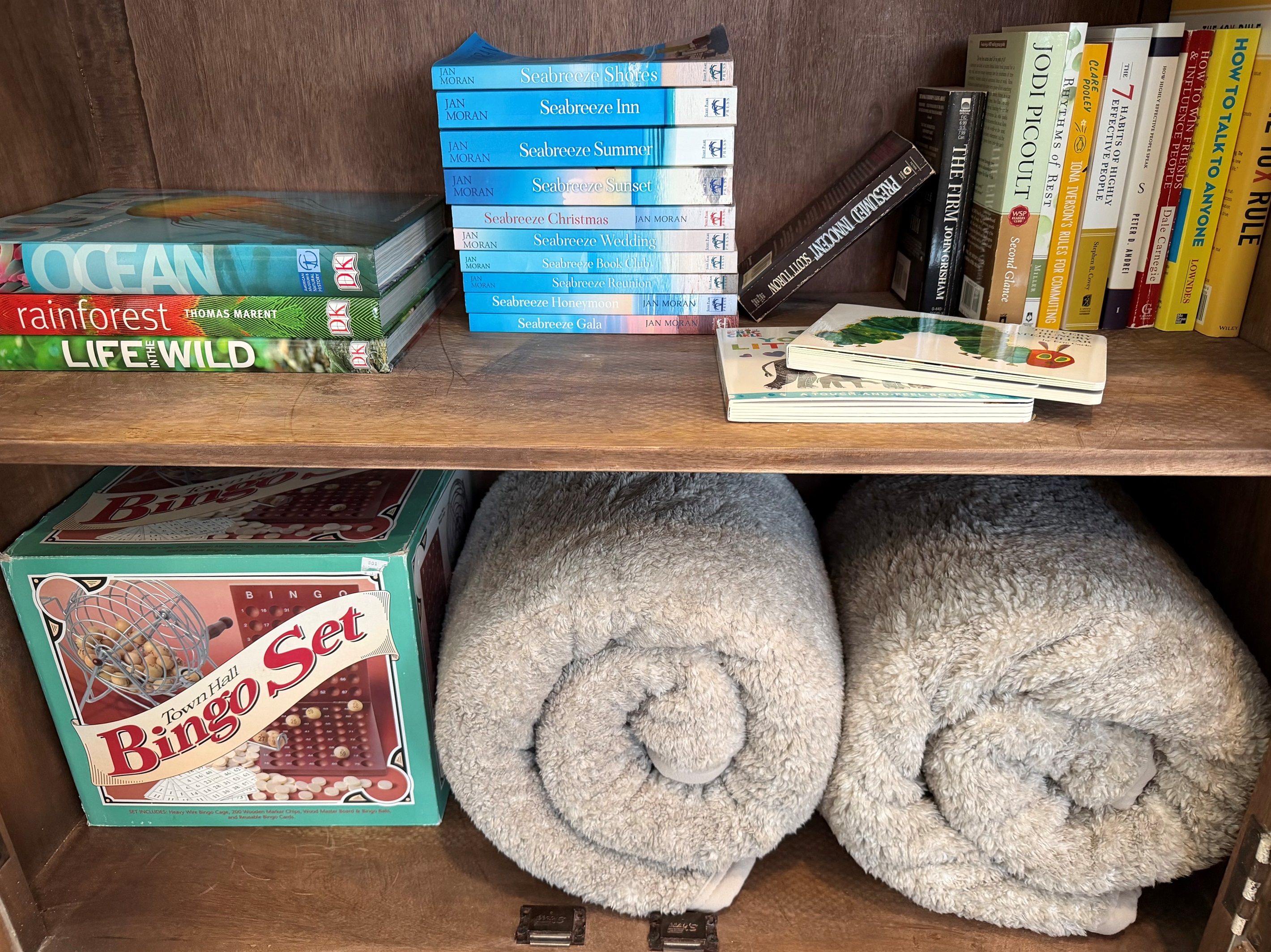 Our Prominence community features a huge 5000 square foot zero entry, resort-style family friendly HEATED pool (October/November and March/April), lounging cabanas, outdoor gas grills, and his and her bathhouses. There is also an additional pool available for your use on the Prominence south side (not heated). Our home also features a large grassy area on each side of the building. It’s a great area for yard games or just rinsing off your sandy toes after a fun day at the beach. Feel like staying in? Enjoy a book or one of our board or card games. There’s something for everyone.